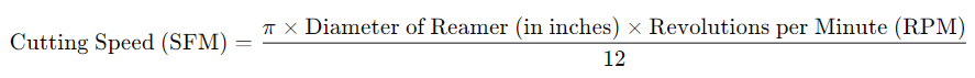 Unter Schnittgeschwindigkeit oder Oberflächengeschwindigkeit versteht man die Geschwindigkeit, mit der sich die Schneidkante der Reibahle über das Werkstück bewegt. Sie wird typischerweise in Oberflächenfuß pro Minute (SFM) oder Metern pro Minute (m/min) gemessen. Um die richtige Schnittgeschwindigkeit für eine Reibahle zu berechnen, verwenden Sie die folgende Formel: