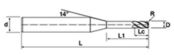 | NNX Hartmetall-Schaftfräser für Kupferelektroden | D0,1 ~ D0,9 | 0 -0,005 | R0,05~R2 | /-0,005 | CR0,05 ~ CR0,5 | /-0,005 | 0 0.3 | 0 0.3 | 0.5 -0,5 | h5 |