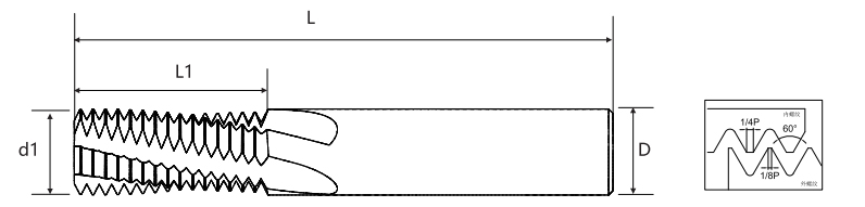 | Tonhöhe | Grobe Zähne UNC | Feine Zähne UNF | Ultrafeine Zähne UNEF | Klingendurchmesser d1 | Effektive Klingenlänge L1 | Griffdurchmesser D | Gesamtlänge L | Klingenanzahl | Durchmesser des unteren Lochs |